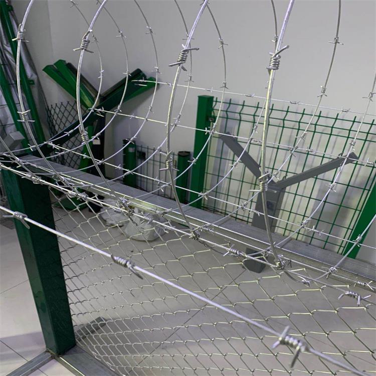 鋁包鋼絲菱形網(wǎng)采用冷拉低碳鋼絲外徑包裹鋁層的防腐處理,鋁包鋼絲抗拉強(qiáng)度應(yīng)達(dá)到500Mpa,立柱采用由冷軋鋼帶直縫焊接而成的矩形燕尾鋼管并做內(nèi)外防腐處理,要求鋼帶抗拉強(qiáng)度應(yīng)達(dá)到375Mpa;斜撐采用由熱軋鋼帶直縫焊接而成的矩形鋼管并做內(nèi)外防腐處理,要求鋼帶抗拉強(qiáng)度應(yīng)達(dá)到375Mpa。延伸臂由熱軋角鋼焊接而成并做防腐處理,要求抗拉強(qiáng)度應(yīng)達(dá)到375Mpa。鋁包鋼絲滾籠為主絲直徑3.0mm的冷拉高碳鋼絲,抗拉強(qiáng)度應(yīng)達(dá)到1340Mpa;刺絲為直徑2.2mm的冷拉低碳鋼絲,抗拉強(qiáng)度應(yīng)達(dá)到500Mpa,鋁包鋼刺絲為主絲直徑2.8mm的冷拉高碳鋼絲,抗拉強(qiáng)度應(yīng)達(dá)到1340Mpa;刺絲為直徑2.2mm的冷拉低碳鋼絲,抗拉強(qiáng)度應(yīng)達(dá)到500Mpa,間距均為100- 200mm。鋁包鋼絲滾籠與刺鋼絲采用不銹鋼扎絲連接,沿長(zhǎng)度方向每隔500mm設(shè)4個(gè)連接處。